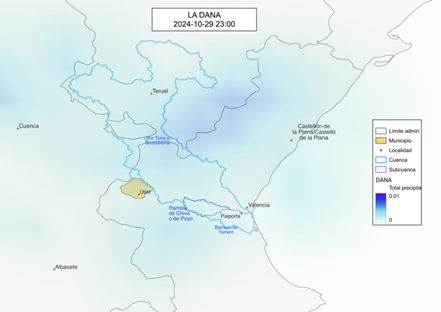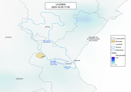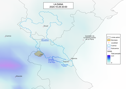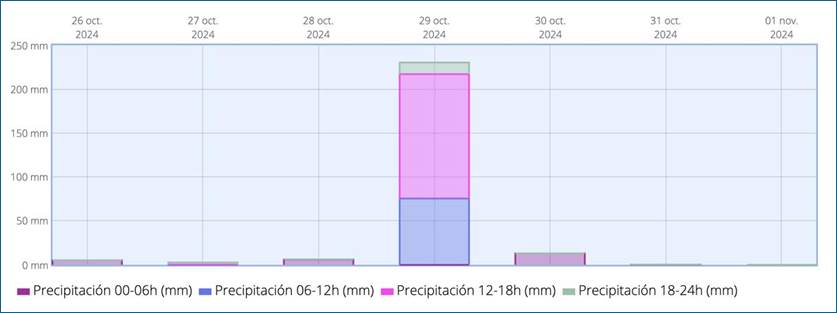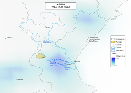 Pese a las alertas, los responsables de poner a resguardo a la población optaron por dedicar el tiempo a sus propios intereses, la primera alerta de la agencia estatal de meteorología llegó el 23 de octubre de 2024, seis días antes de la tragedia, el 29 se declara peligro extremo, desde las primeras horas de ese día inician las lluvias, aunque lejanas de la zona que a posteriori sería la de mayores daños. Desde de las 11 de la mañana de ese fatídico martes, lluvias de diferente intensidad se prolongan por más de 12 horas en y alrededores de la rambla (barranco) de Chiva o de Poyo (Figura 2), a partir de ahí todo fue caos.