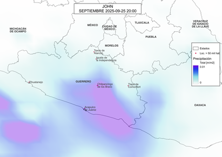 Figura 6. La velocidad y trayectoria del huracán John lo mantuvieron alrededor de Acapulco.